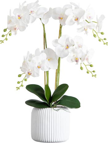 Flowers are always a good idea. But running to the store every week to pick a fresh arrangement is a time-consuming task for those with busy lifestyles. Why not have faux-ever flowers on your desktop? The silk orchids are crafted using the highest quality materials—quality you can literally touch. Inspired by nature, you'll see the details in the petals, whitish hues, and impressive silhouette. Standing 26" tall in a decorative planter, this piece enhances your living areas with maintenance-free beauty. Great for both offices and homes, this is a great set for any space in need of a soft touch.