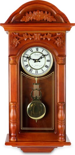 Bedford Clock Collection offers you the elegance and beauty of classic style with the modern reliable technology of today's wall clocks. Whether a gift to your self or for someone else, this clock will add a special touch of sophistication to any room. With its stunning Padauk Oak finish, Golden Accents and Swinging Pendulum, this wall mountable time piece is not only an attractive focal point, but a functional and reliable piece of technology. With 4 distinct Chimes, the clock will announce the beginning of each new hour for your convenience. Carved details and special touches through out , as well as a convenient Sleep Mode that provides you with the option to pause the melodic chimes of this beautiful time piece for an entire 12 hour period with a simple push of your finger. Item Dimensions: 5.75" x 12.75" x 27.50" Item Weight: 9.60lbs