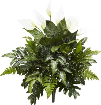 Bright white blooms are growing out of the top of this unique artificial mixed spathiphyllum plant. With a variety of light and dark green colors as well as a fun blend of smooth and lobed leaves, this set of two is a complete look all on their own. Standing at 27 inches tall, you can place them in a short brown vase on your bookshelf or next to a lamp on your side table to add a more subdued touch of nature to your study.