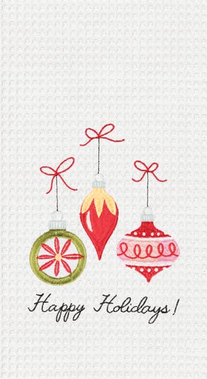 27" x 18" Christmas "Happy Holidays" Sentiment Featuring 3 Ornaments Cotton Embroidered & Waffle Weave Kitchen Dish Towel