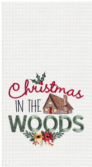 27" x 18" "Christmas In The Woods" Sentiment with Log Cabin Embroidered Cotton Waffle Weave Kitchen Dish Towel