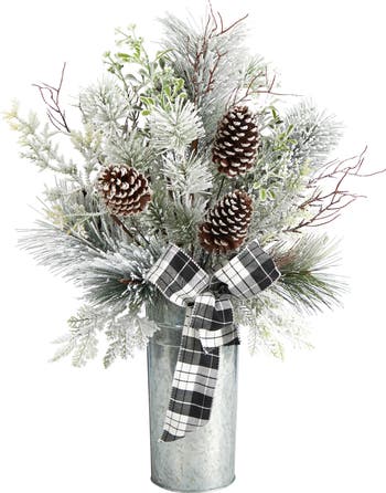 28-in Frosted Greenery and Pinecone with Plaid Bow Artificial Christmas Arrangement in Decorative Tin