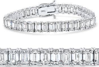 This classic women's bracelet features 41 huge emerald cut lab grown diamonds. All diamonds are prong set in a 14k white gold mounting. The bracelet features a double lock for security and durability. The mounting has good flex and beautiful enough to wear every day.