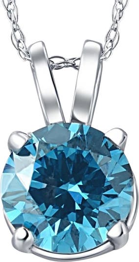 This classic womens pendant features one genuine blue color enhanced. The diamond is prong set in a solid white gold setting. An 18" white gold clasp lock chain is included.