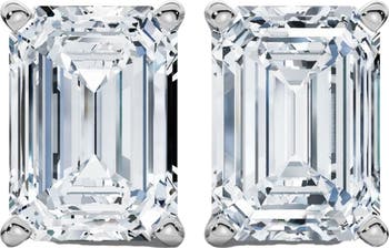 This stunning women's pair of earrings features two matching pair of emerald cut genuine lab grown diamonds. All diamonds are prong set in solid 14k gold and secured with 14k butterfly backs.
