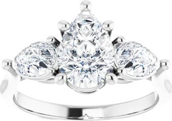 This high quality women's ring features a stunning 1 1/4ct pear shape lab grown diamond and two accent pear shape matching diamonds . All stones are set in solid 14k white gold polished prong setting. Chose white or yellow gold.