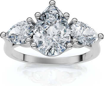 This high quality women's ring features a stunning 1 1/4ct pear shape lab grown diamond and two accent pear shape matching diamonds . All stones are set in solid 14k white gold polished prong setting. Chose white or yellow gold.
