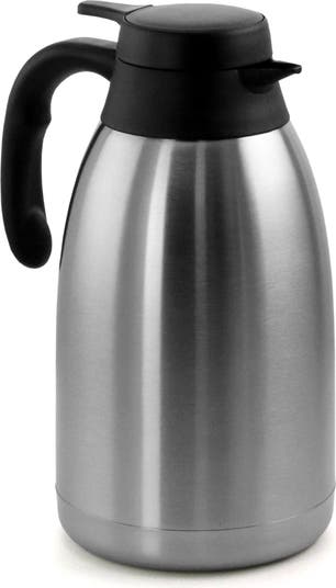 Keep your drinks hot with MegaChef's 2 Liter Large Insulated Stainless Steel Hot Water and Beverage Flat Top Carafe for Coffee and Tea. This versatile and convenient hot beverage carafe is a great tool to have on hand for all gatherings and events. This thermos is equipped with stainless steel insulation, ensuring beverages stay at their desired temperature for hours. The thermos is also equipped with an easy to pour dispenser that can securely be opened and closed using the single touch safety latch near the handle, securing the hot liquids and minimizing spills. Thermos' screw off top can be opened with ease and stays on securely. The thermos also comes with a 4.5" non-burn handle attached for easy transportation. Ideal for all types of gatherings such as events, meetings, tailgates, barbecues, birthdays, and fundraisers.