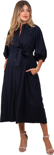 Elevate your maternity style with our 3/4 Bubble Sleeve Maternity Midi Shirt Dress. Designed for both comfort and chic appeal, this versatile piece features playful bubble sleeves, handy side pockets, and a flattering midi length that grows with you. The lightweight fabric drapes beautifully over your bump, making it perfect for any trimester. Dress it up with heels for special occasions or pair with sneakers for a casual day out. Classic button-down details and the sophisticated hue make this dress a timeless wardrobe staple for every mama-to-be. Stay stylish and comfortable all pregnancy long!
