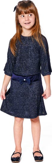 Insets down each side add a touch of contrast to this shimmering lurex party dress. Made from sparkling brushed knit fabric, this versatile dress features a 3/4 sleeve bodice with a round neckline, a solid waistband with a decorative bow detail, and a flared mini skirt with contrasting side insets that add a playful touch.