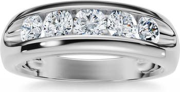 This high quality mens' ring features five round brilliant cut lab grown diamonds prong set in solid 14k gold polished mounting. The diamonds encircle the entire ring and finished with a polished mirror look.