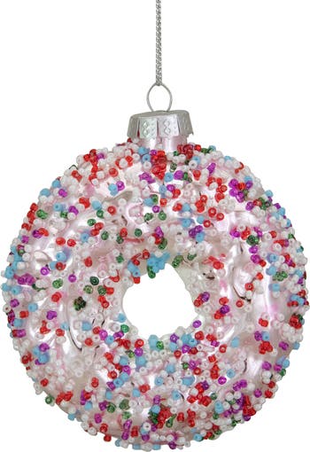 Add the sweet treat of a sprinkled doughnut to your tree this holiday season. This doughnut features pink frosting and is accented with multi-colored beads for sprinkles. This will be the perfect addition to your tree, your mantle, window, or anywhere you wish to add a little holiday cheer. Product Features: Glass doughnut Christmas ornament Pink frosting-covered doughnut Accented with multi-colored beads as sprinkles Fully dimensional ornament Comes ready to hang on a silver cord For indoor use only Dimensions: 3.75" diameter x 1.25" deep Material(s): glass
