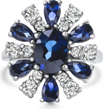 Nicole Blue Sapphire & Diamond Ring in 14K White Gold This elegant design features seven lab grown blue sapphires, with the centerpiece showcasing an 8x6mm oval sapphire. Surrounding the sapphires are lab grown diamond accents, adding brilliance and contrast to the rich blue hues. Expertly crafted in solid 14k white gold, the Nicole ring is a timeless blend of sophistication and modern luxury. Size 5.5.