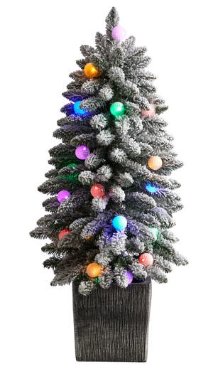 Show your true colors during Christmas with this flocked artificial Christmas tree. Inspired by nature, this robust silhouette mimics the real natural foliage and texture found in their European counterparts with snow in the easy-to-bend branches. Arriving pre-strung with 20 LED lights, illuminate your space with disco ball like lights, that bring a colorful addition to the holidays. Standing 3ft. from a decorative planter, feel free to add in any compact area in need of Christmas cheer. This is a favorite among kids that love bright colors. Faux Christmas Trees are manufactured using synthetic materials, such as polyester material or plastic, and are well designed and constructed to be life-like in appearance. This item will need to be re-shaped when removed from the secure box to allow it to reach its fullest size. Your artificial Christmas Tree will look beautiful for years to come; simply wipe clean with a soft dry cloth when needed.