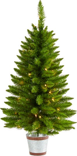 Create a traditional Christmas scene even in the smallest settings with the help of this easy and effortless artificial Christmas tree! Completely maintenance-free, this realistic looking fake Christmas tree boasts tiers of evergreen foliage made up of 114 easy-to-bend branch tips for showcasing your favorite holiday ornaments. Arriving pre-strung with 50 warm white lights to eliminate tangles and carefully stabilized in a metal planter, this versatile 3' tall artificial Christmas tree will not only make decorating a breeze but ensure your home is always holiday-dressed for years to come.