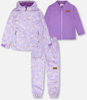 Designed for every season’s surprise, this 3-in-1 mid-season outerwear set in purple with daisy print offers versatility, warmth, and eco-conscious comfort. It includes a jacket, removable polar fleece jacket, and coordinating pants, all crafted with recycled materials and treated with a fluorocarbon-free BIONIC-FINISH® ECO coating for lasting protection. With a fleece-lined hood, taped seams, reinforced knees, and reflective details, this set adapts to changing weather while keeping your girl cozy and dry.