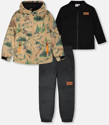 Rugged and reliable, this 3-in-1 mid-season outerwear set in brown with motocross print is perfect for boys and baby boys ready for adventure. It includes an outer jacket, removable polar fleece jacket, and matching pants, all crafted with recycled materials and treated with a fluorocarbon-free BIONIC-FINISH® ECO coating for durable water and dirt repellency. Reinforced knees, reflective accents, and a fleece-lined hood make this eco-conscious set both practical and comfortable for outdoor play.
