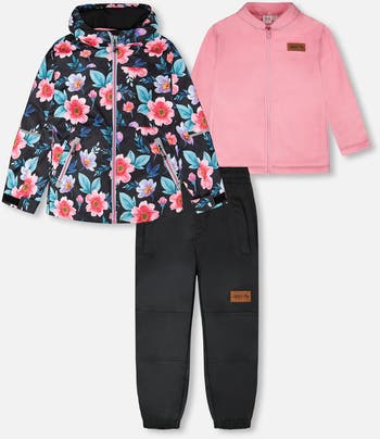 Stylish and functional, this 3-in-1 two-piece mid-season outerwear set with printed flowers is designed to adapt to shifting weather with ease. The set includes an outer jacket, removable polar fleece jacket, and coordinating pants, all crafted from recycled materials and treated with a fluorocarbon-free BIONIC-FINISH® ECO coating for long-lasting water and dirt repellency. With a fleece-lined hood, reinforced double knees, and reflective details, this eco-friendly set ensures comfort, durability, and everyday style.