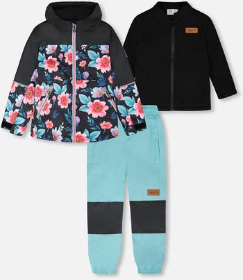 Stylish and functional, this 3-in-1 two-piece mid-season outerwear set with printed flowers is designed to adapt to shifting weather with ease. The set includes an outer jacket, removable polar fleece jacket, and coordinating pants, all crafted from recycled materials and treated with a fluorocarbon-free BIONIC-FINISH® ECO coating for long-lasting water and dirt repellency. With a fleece-lined hood, reinforced double knees, and reflective details, this eco-friendly set ensures comfort, durability, and everyday style.