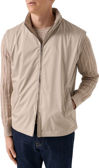 A lightweight jacket made from water-repellent tech fabric features a wind-blocking collar, removable sleeves and a stowaway hood to give you the coverage you need in any weather conditions.