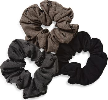 A tiny bow print adorns this set of three scrunchies in neutral hues, bringing a subtle dash of whimsy to your everyday hairstyles.