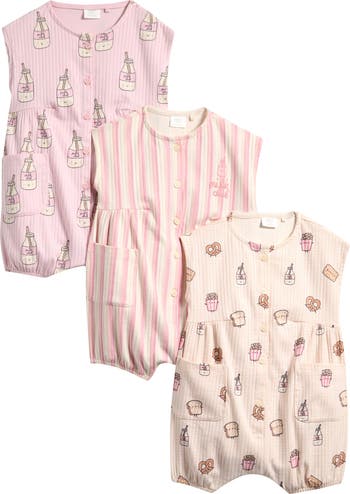 Warm days were made for this set of three adorably patterned rompers with buttons at the front and a stretch-cotton knit.