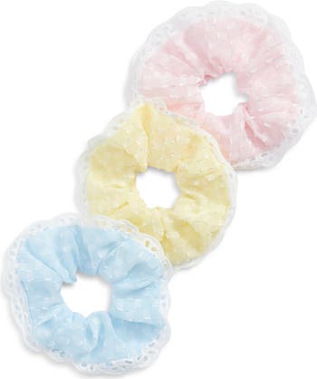Soft pastel hues and airy eyelet bring playful charm to this set of three scrunchies designed to hold your kiddos hair with gentle comfort.