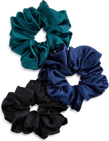 Smooth satin creates pain-free scrunchies that come in black and rich cool tones.