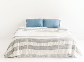 This versatile lightweight bedspread blanket showcases the best in luxury bedding with three separate panels bound together using traditional hand-stitching techniques. Each piece is meticulously hand-woven in Ethiopia from our signature hand-spun cotton while traditional looms create a subtle depth of texture in this dotted pattern. Generously sized at 90 x 120 inches, this blanket fits beautifully on both queen and king-sized beds. Machine wash & dry.