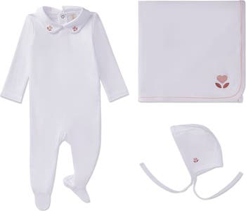 Your baby's skin is amazingly delicate. That's why we've crafted this 3-piece set with 100% Pima cotton, famous for buttery softness. The full set includes our cozy footie (with charming Peter Pan collar) plus our matching bonnet and blanket -- all adorned with dainty embroidered hearts.