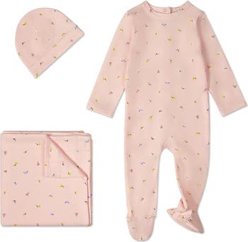 She'll be cozy from top to toe in this beautiful 3-piece set. The charming cuffed cap keeps her little noggin toasty. The cute cuddle blanket surrounds her with cloud-like softness. And the comfortable footie pampers her delicate skin. All 3 pieces come in our cotton-rich blend with a dainty floral print for feminine charm.