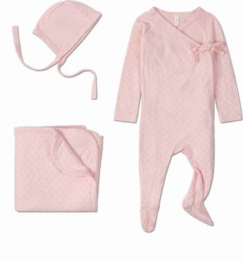 Ready for cuteness overload? Check out this 3-piece pointelle footie set. From its cozy cap and cuddly blanket to its pretty bow-trimmed footie, it's loaded with style and charm. All 3 pieces are crafted for comfort in a breathable fabric blend featuring super-soft Rayon. Perfect baby shower gift.