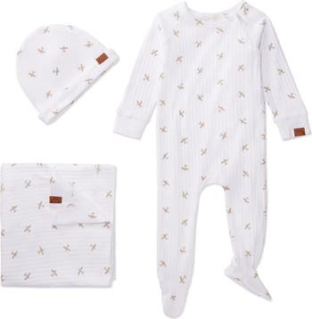 Keep him comfy from top to toe in this 3-piece footie set. You get a cute zip-up footie, a head-warming beanie, and a snuggly swaddle blanket -- all featuring our fun airplane print for a playful, sporty look. Then there's the stretchy ribbed fabric, blending super-soft cotton with flexible spandex for cozy shape-keeping fit. Perfect shower gift.