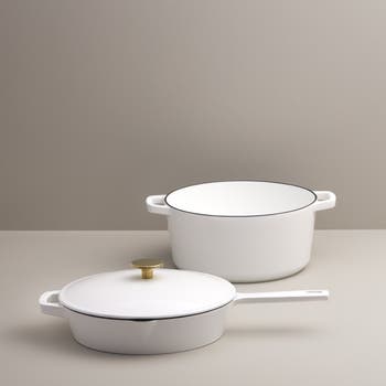 It's the French-inspired, California-designed enameled cast iron cookware designed to inspire newcomers and satisfy pros. This three-piece set comes complete with the Milo Classic Dutch Oven and Skillet. Enameled inside and out with a luxurious matt black or our glossy white porcelain finish. Bring the three-piece collection home today. 5.5 Quart Enameled Dutch Oven 5.5 Quart Lid (fits 5.5 Quart Enameled Dutch Oven and Skillet) 10-Inch Ultimate Skillet We offer a lifetime warranty. That means, if at any point in the lifetime of your Milo it becomes unusable due to normal use, we'll replace it, free of charge. If you can't tell, we really believe in Milo.
