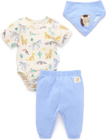 Our 3 Piece Set is the perfect blend of essential layers for your little one. Featuring a snap clip bodysuit with an all over animal print, solid coloured leggings and a sweet matching bandana bib. Made from our 100% Cotton for a soft touch against their delicate skin. This set makes the perfect gift!