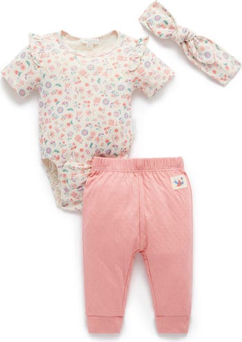 Our 3 Piece Set is the perfect blend of essential layers for your little one. Featuring a snap clip ruffle bodysuit in an all over floral print, solid coloured leggings and a sweet matching bow headband. Made from our 100% Cotton for a soft touch against their delicate skin. This set makes the perfect gift!