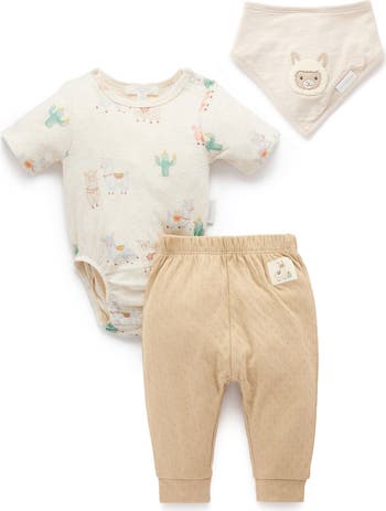 Our 3 Piece Set is the perfect blend of essential layers for your little one. Featuring a snap clip bodysuit with an all over animal print, solid coloured leggings and a sweet matching bandana bib. Made from our 100% Cotton for a soft touch against their delicate skin. This set makes the perfect gift!