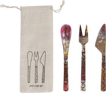 This Hand-Forged Copper Appetizer Set, measuring 6.25 inches in length, features a unique burnt finish that adds a touch of rustic elegance. Perfect for antique, vintage, rustic, and industrial styles, this set enhances the charm of any dining experience. Made of durable copper, it ensures durability and a timeless appeal. The set comes in a printed drawstring bag, making it a practical and stylish addition to serveware collection. The set includes four individual pieces, each with a different design, adding variety to any table setting. Whether used for serving appetizers or as decorative accents, this hand-forged copper set is sure to impress guests with its artisanal craftsmanship.