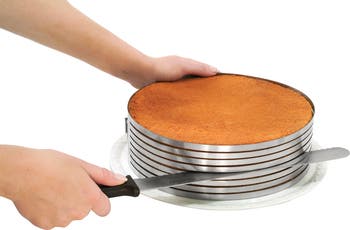 Makes slicing up to eight uniform layers a "piece of cake"! 3-piece kit includes adjustable, grooved slicing mold, 12" serrated baker's knife and 11" cake lifter. Pair it with one of the extra-deep springforms for up to eight layers or a standard one for up to four layers.