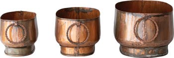 - An elegant set of oval metal planters with an antique copper finish and ring handles