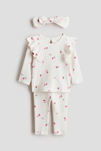 Printed set with a top, a pair of leggings and a headband in soft, ribbed cotton jersey. Long-sleeved top with a round neckline, keyhole opening with a button at the back and picot-trimmed flounces at the front that continue over the shoulders. Leggings with an adjustable, elasticated waist. Headband detailed with a bow at the front, and covered elastication at the back.