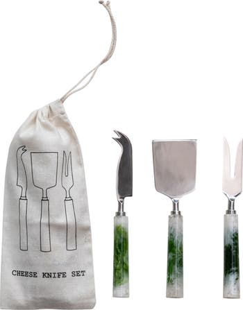 3-Piece Stainless Steel Cheese Utensils with Marbled Resin Handles, Green and White
