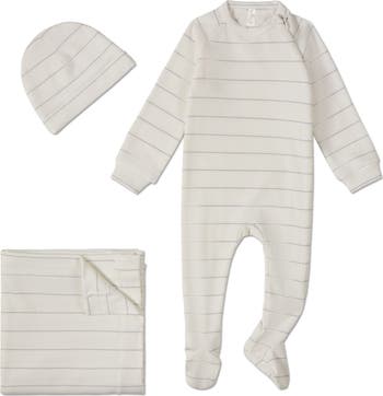 It's your cherub's chance to shine. Our 3-piece baby footie set boasts lustrous lurex stripes for a touch of glimmer and glow. Ultra-soft mini-ribbed fabric stretches for flexible fit, while chafe-free flat-locked seams ensure comfort and durability. Perfect baby shower gift.