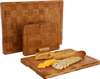 Upgrade your kitchen essentials with the MegaChef 3 Piece Wood Checkered Pattern Cutting Board Set with Storage Holder, a perfect balance of beauty, function, and durability. Crafted from premium wood and coated with protective wood wax oil, each board features a subtle monochrome checkered design that enhances your kitchen décor. The set includes three cutting boards in multiple sizes-large (17 x 12 x 0.98 inches), medium (14 x 10 x 0.98 inches), and small (10 x 7 x 0.98 inches)-giving you the ideal surface for every meal prep task. Juice grooves along the edges help prevent spills, while integrated handles make lifting and serving effortless. Designed for both performance and organization, the cutting boards rest neatly in the included countertop storage base (3 x 5.9 x 1.6 inches) for easy access and a clutter-free workspace. Naturally strong and sustainable, wood resists knife scarring and absorbs less moisture, ensuring long-lasting use. Ideal for chopping, carving, and serving, the MegaChef Checkered Cutting Board Set brings professional-grade quality to your home kitchen. Simply hand wash to preserve the wood's natural finish and keep your boards looking beautiful for years to come.