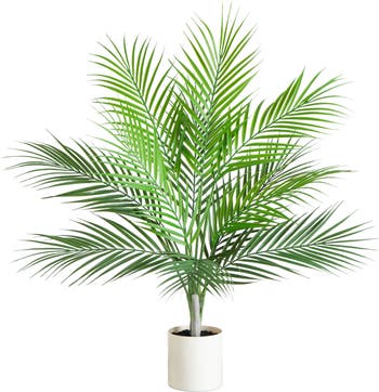 Keep the spirit of summer alive all year long with our 30-In artificial palm tree. Inspired by the vibrant beauty of the tropics, this palm tree showcases a stunning array of fronds in varying shades of green, paired with a trunk that boasts lifelike textures and details. Adjust the fronds to fit your desired look. Perfect for refreshing any room, whether it’s your bathroom, bedroom, nursery, or kitchen, this palm tree brings a touch of natural elegance wherever it’s placed. The vanilla planter, complete with realistic artificial soil, enhances the lifelike quality.