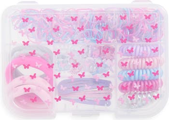 This butterfly-printed case perfectly organizes 300 hair accessories that include rubber bands, butterfly clips, and scrunchies.