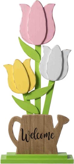 This 30"H Easter Wooden Porch Decor features colorful wooden tulips with green stems and leaves, arranged in a brown watering can marked "Welcome" all set on a green base to add a cheerful, inviting touch to your porch.
