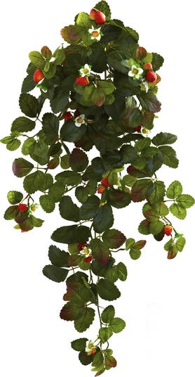 Rich, red strawberries are interwoven with fresh berries for a delicious hanging bush. Dainty cream flowers are spread throughout for a full, blooming look. Pair with a rustic planter for simple, farmhouse style.
