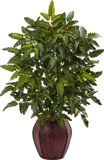 This two and a half foot floor plant has multi-tone green leaves that curve in every direction to mimic a true fern. Each leaf has serrated edges and can be adjusted to create a fuller look. Comes in a brown planter with woven sides.