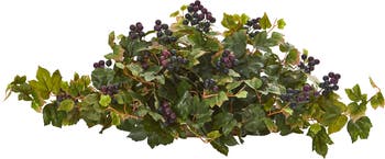 Create a garden-inspired theme indoors with this artificial grape leaf plant boasting a dense collection of dark green foliage, sprinkled throughout with small clusters of darkly colored grapes. Set on decorative foam for easy placement, this silk plant reaches 33in. in length.